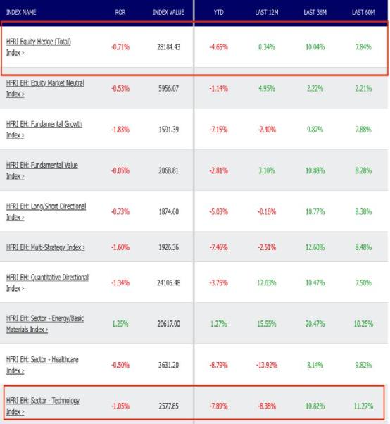 根据HFR的数据,股票对冲策略指数HFRI Equity Hedge 指数今年前三个月下跌4.65%。细分策略中,科技相关的策略前三个月已跌去8.38%,表现仅仅好于医药策略跌去的13.92%。