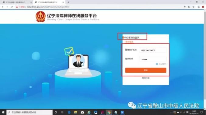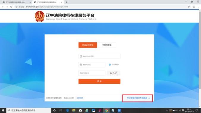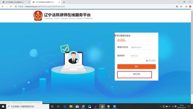 第一步:点击律师诉讼跳转律师平台,点击单位管理员登录专用通道,点击单位注册