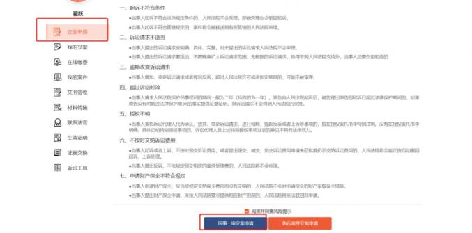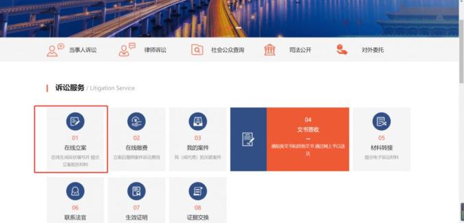 在首页点击【我要立案】,选择相应功能模块(审判立案、执行立案),跳转是否愿意接受第三方机构调解,根据需要选择,当选择不愿意时跳转至审判立案,选择法院,按页面指引填写案件信息,上传材料,提交立案申请,填写当事人信息,提交即可。
