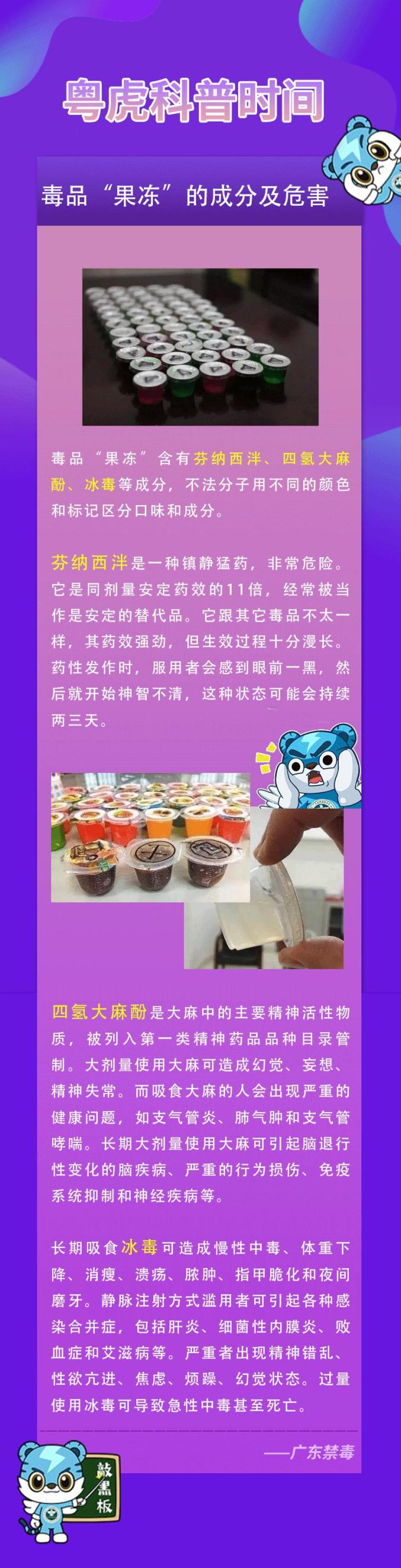 毒品果冻被做成不同的颜色和标记,用来区分口味和成分,主要成分有芬纳西泮、四氢大麻酚、冰毒等,过量服用会产生幻觉、失忆、嗜睡以及认知障碍,严重可致人死亡。