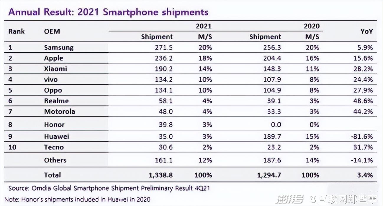 而2021年全球智能手机出货量排名前五名的品牌依次为三星、苹果、小米、OPPO 以及 vivo。其中,三星市场占比 20.1%、苹果为 17.4%、 小米为 14.1%、OPPO 为 9.9%、vivo 为 9.5%。