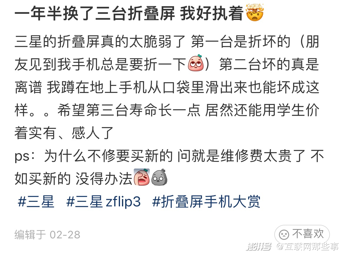 另一方面无论是在黑猫投诉,亦或是在社交平台上,都能够看到消费者对折叠屏手机技术不成熟,以及维修费用高等问题的吐槽。