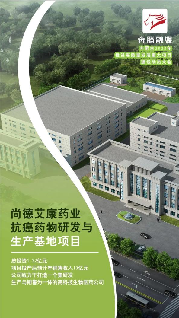 尚德艾康药业抗癌药物研发与生产基地项目位于鄂尔多斯国家高新技术开发区,由天津尚德药缘科技股份有限公司投资建设,总投资1.32亿元。