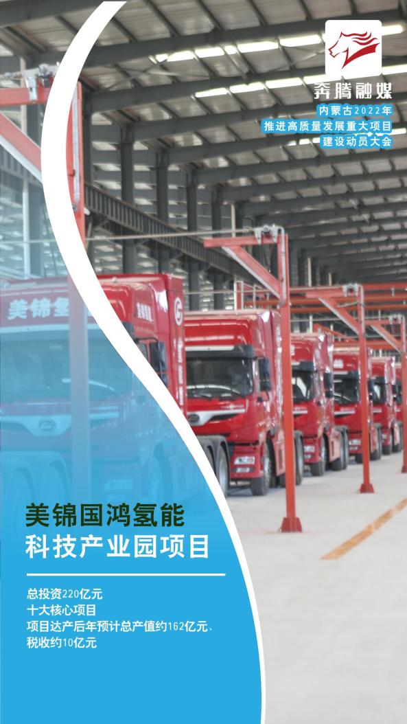 美锦国鸿氢能科技产业园项目位于蒙苏经济开发区江苏工业园区西片区,总投资220亿元,将分三期投资建设,分别建设成“新能源整车生产基地”“核心零部件生产基地”“可再生氢能供应链基地”“储运综合能源站”四大板块,以及新能源整车生产制造、氢能商用车动力系统集成、氢能燃料电池电堆生产、加氢站装备、绿色能源电解水制氢、化工尾气PSA提纯制氢、油氢气电综合能源站、氢气智能安全储运、氢能生态智慧管理服务平台、集中式光伏发电等十大核心项目。