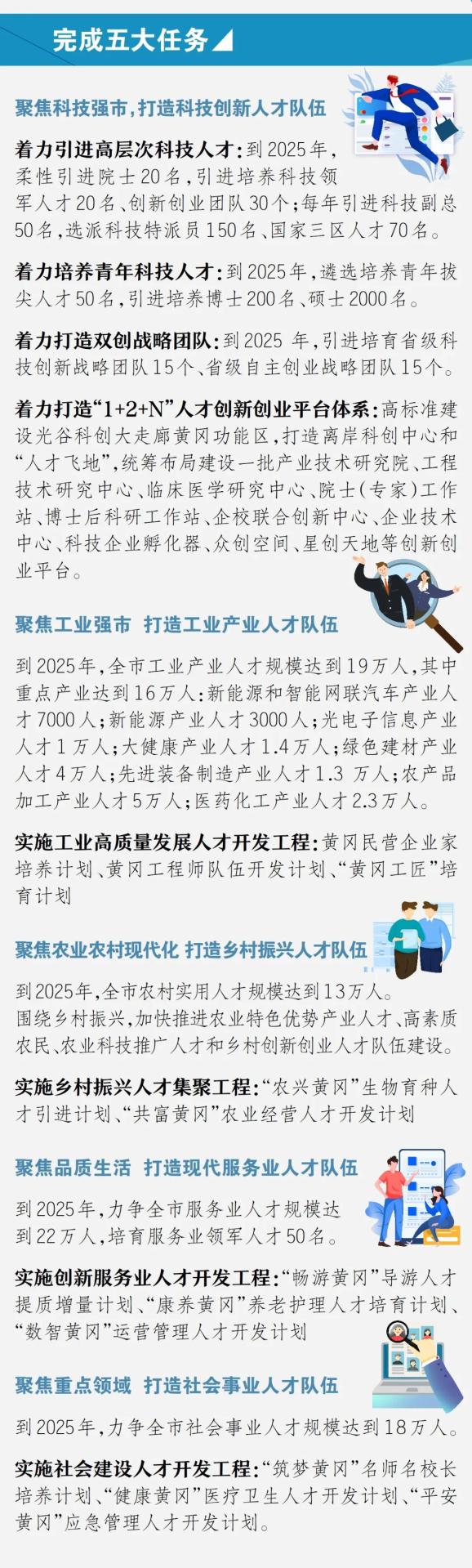 《规划》指出,到2025年,全市人才资源总量显著增加、人才素质显著提高、人才结构分布趋于合理、人才环境显著改善、人才效能持续增强,基本建成大别山区域性人才中心和武汉城市圈重要创新平台。全市人才总量达到77万人,每万常住人口中人才数量达到1280人。
