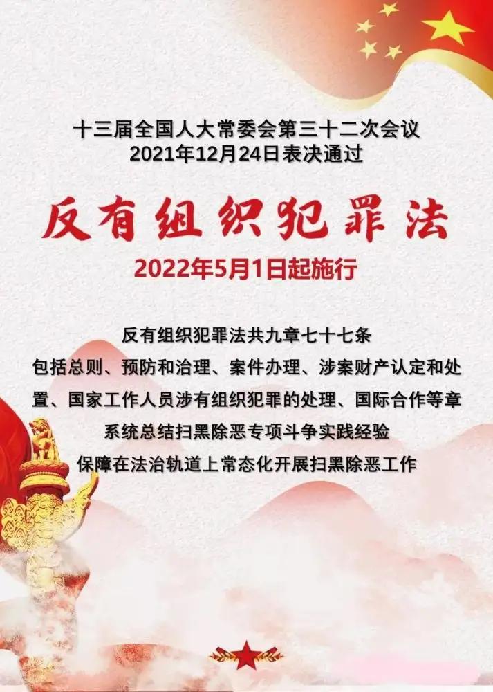 2021年12月24日,第十三届全国人大常委会第三十二次会议审议通过《中华人民共和国反有组织犯罪法》,该法自2022年5月1日起施行。