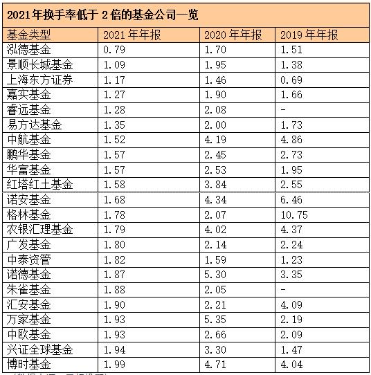 景顺长城基金和上海东方证券的换手率非常率,2021年换手率为1.09倍、1.17倍。此外,嘉实基金、睿远基金、易方达基金、中航基金、鹏华基金、华富基金、红塔红土基金等换手率也较低。