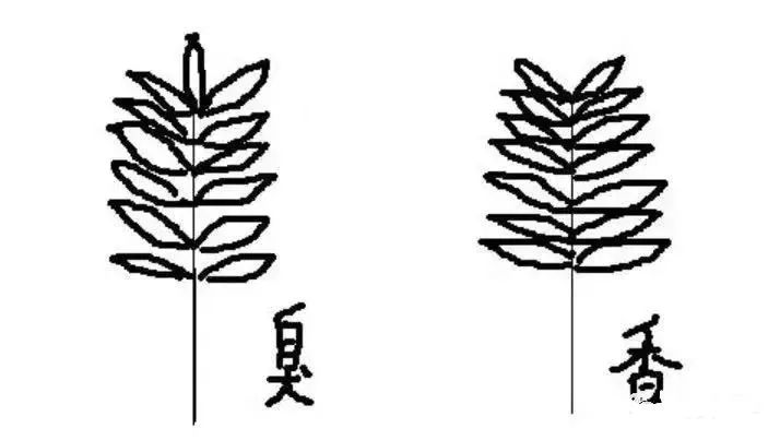 “香椿”和“臭椿”区别如下:香椿叶的边缘有稀疏锯齿,而臭椿叶则没有;采摘的话,可以从复叶的特点直接判断(如下手绘图);