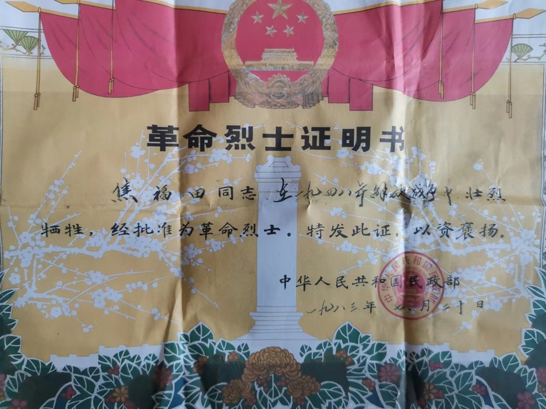 “烈士证邮寄回来了,只知道俺哥牺牲了,但安葬在哪里却无人知晓。”焦福兰说,“爹娘生前始终在托人寻找俺哥的陵墓,但始终杳无音讯,最后带着遗憾离开了人世,临终前还嘱托家中子孙,一定要继续寻找,一定要到俺哥的墓前看看。”