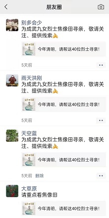 于是,一场为烈士寻亲的接力便在清明假期轰轰烈烈地展开了;一条“为焦像田烈士寻亲,敬请关注,提供线索”的微信朋友圈,也随之传遍成武县的大街小巷……