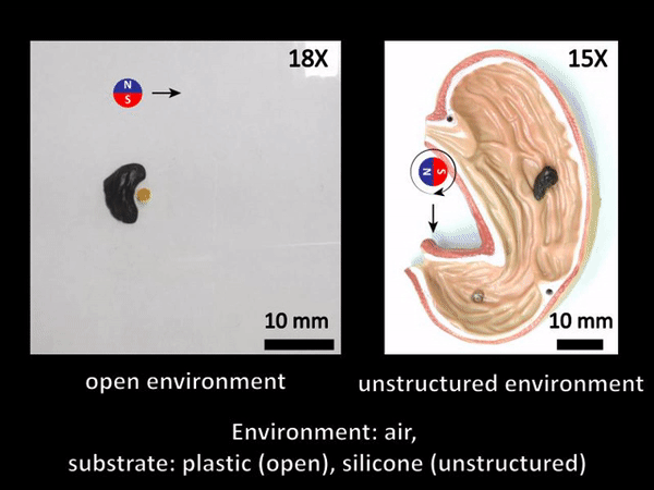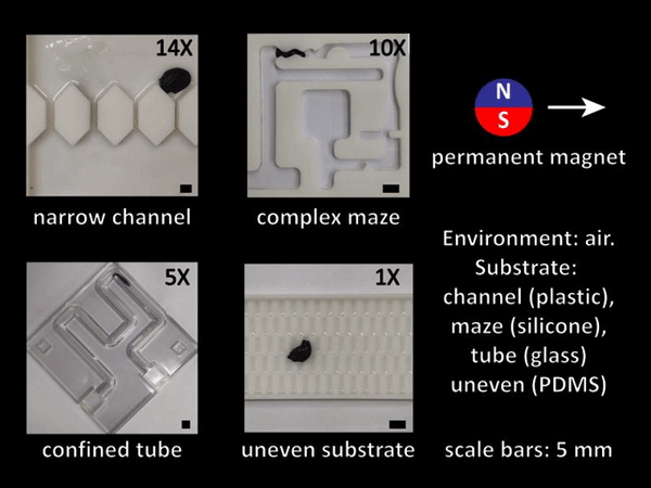 目前,slime 还没有完全的自主控制能力,需要外界用磁力控制它的移动和变形。该研究的重点是磁性粘液的材料特性,最终的目标是按照机器人的方式部署 slime。