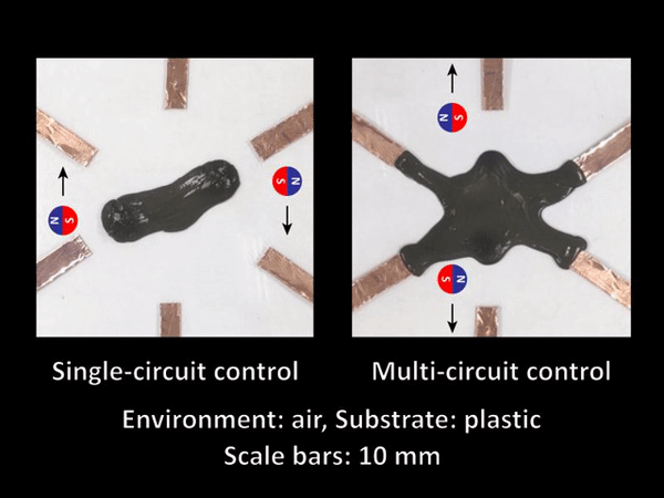 由于该粘液中含有钕磁铁等磁性颗粒,因此能够由磁铁控制其移动和变形,并且具有良好的导电性,可与电极相连,充当电路开关。