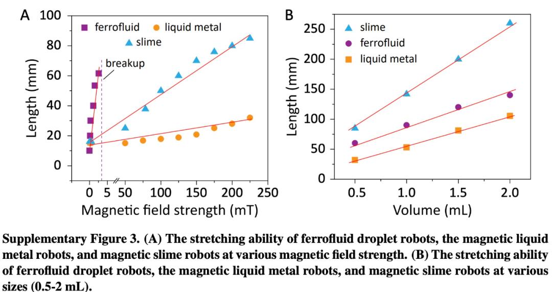 slime 具备极好的拉伸性能,可以通过 1.5mm 的狭窄缝隙而不断裂。该研究在相同的磁场条件下,比较了铁磁流体液滴机器人和 slime 的拉伸能力。