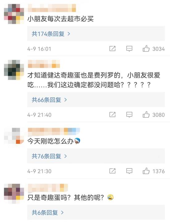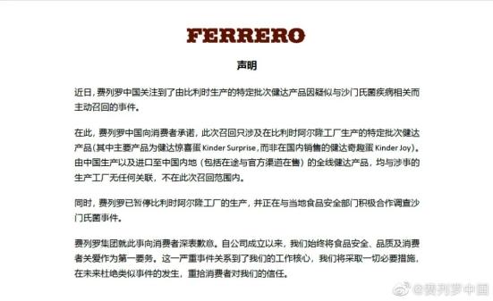 4月9日深夜,针对“费列罗巧克力涉嫌沙门氏菌感染”一事,@费列罗中国 官方微博道歉并回应称,由中国生产以及进口至中国(包括在途与官方渠道在售)的全线健达产品,均与涉事的生产工厂无任何关联,不在此次召回范围内。
