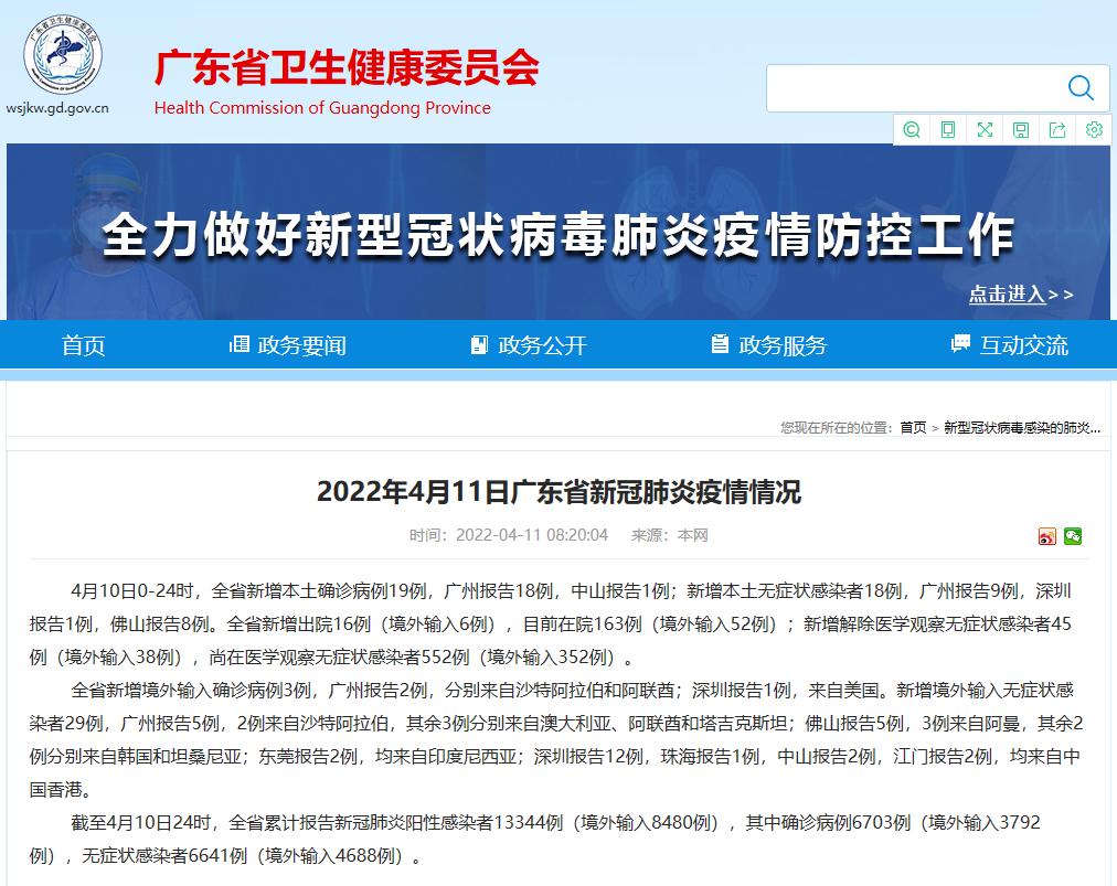 4月10日0-24时,全省新增本土确诊病例19例,广州报告18例,中山报告1例;新增本土无症状感染者18例,广州报告9例,深圳报告1例,佛山报告8例。全省新增出院16例(境外输入6例),目前在院163例(境外输入52例);新增解除医学观察无症状感染者45例(境外输入38例),尚在医学观察无症状感染者552例(境外输入352例)。