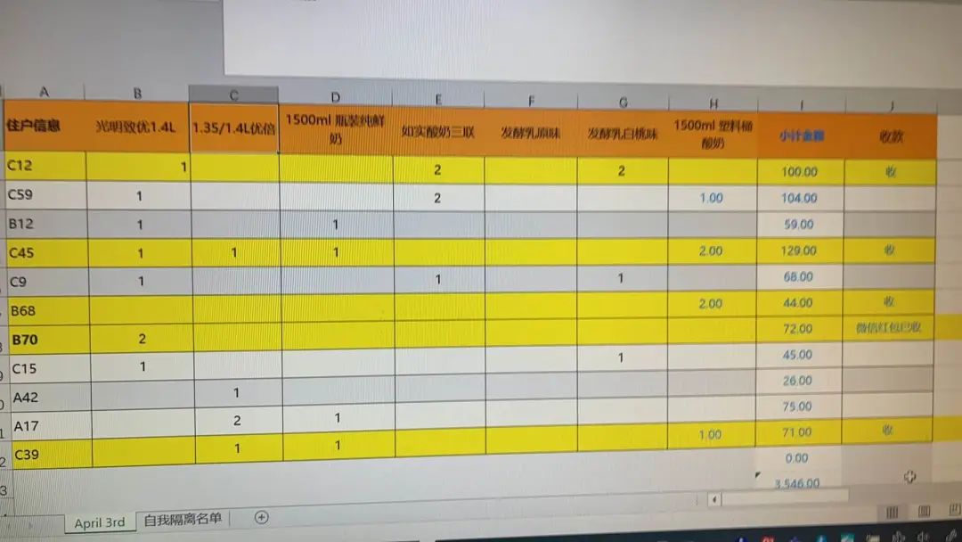 于是4月3日的大部分时间我就在小区群里回答各种问题:包括什么时候送货,为啥这个价格,表格在哪里,什么时候付钱,有没有明治奶、鸡蛋等等。等到截止时间了,还有人在问我明明填了,但是怎么找不到了。我一个一个@邻居们,告诉他们你买的东东在哪里。不要急,都在的。