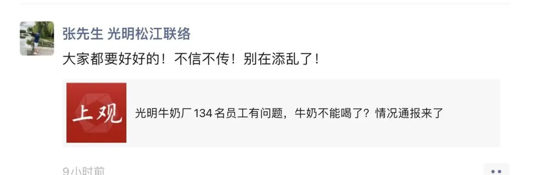 到了4号晚上, 关于光明牛奶有群体感染会影响牛奶供应的段子到处飞,原本以为团购已经告一段落了,因为这则信息,小区群里又开始东一句西一句讨论:“怎么办?我们的牛奶怎么办?会不会不安全,会不会断供”“怎么办,凉拌。耐心等一下,也许是谣言呢?”果不然,和我联系的松江光明联系人张先生在朋友圈贴出一个铿锵有力的回答。我也马上在群里回答大家的疑虑。