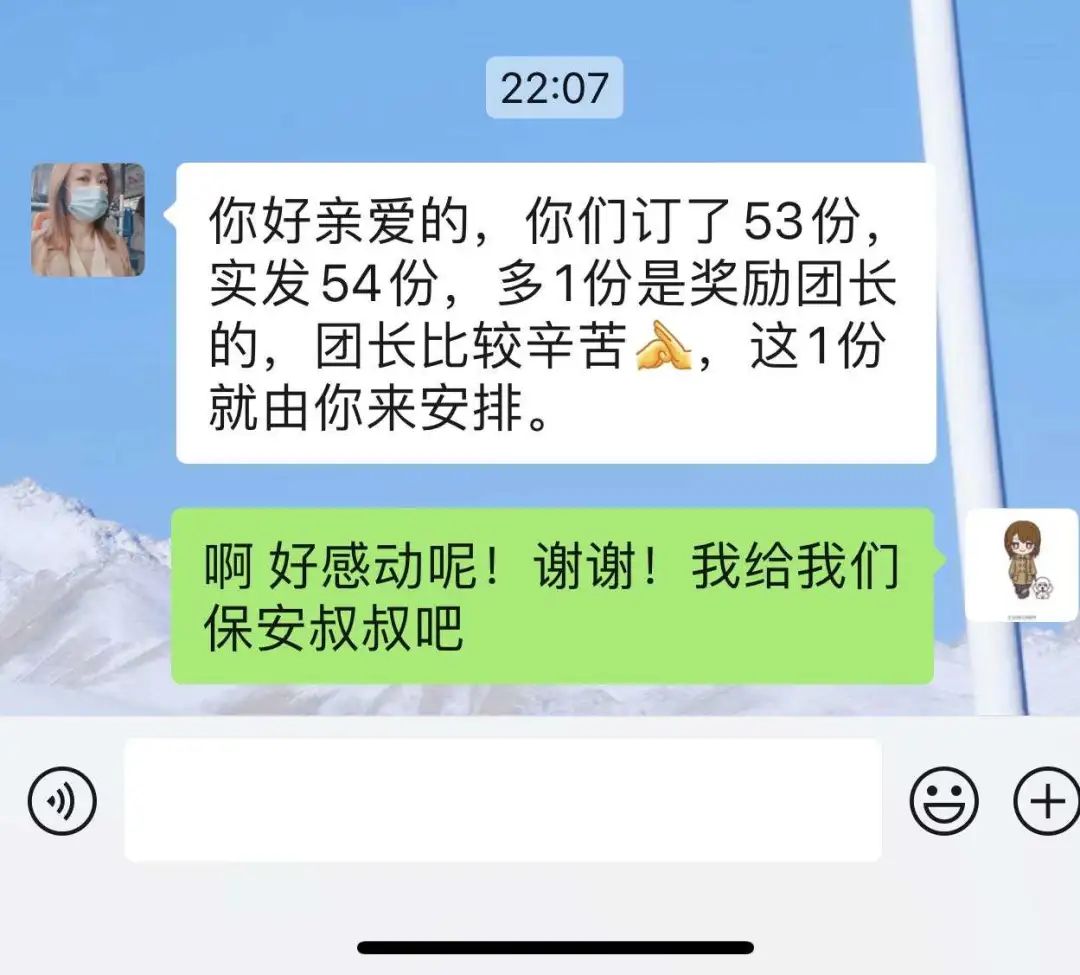 我一边和邻居打招呼,问大家可以吗,其实另一边就敲定了B餐。这种时候,哪还有磨蹭的余地和时间。葛小姐给我发了私信要多送一份肉肉给团长,和Vanessa 一商量,送给保安们改善伙食。