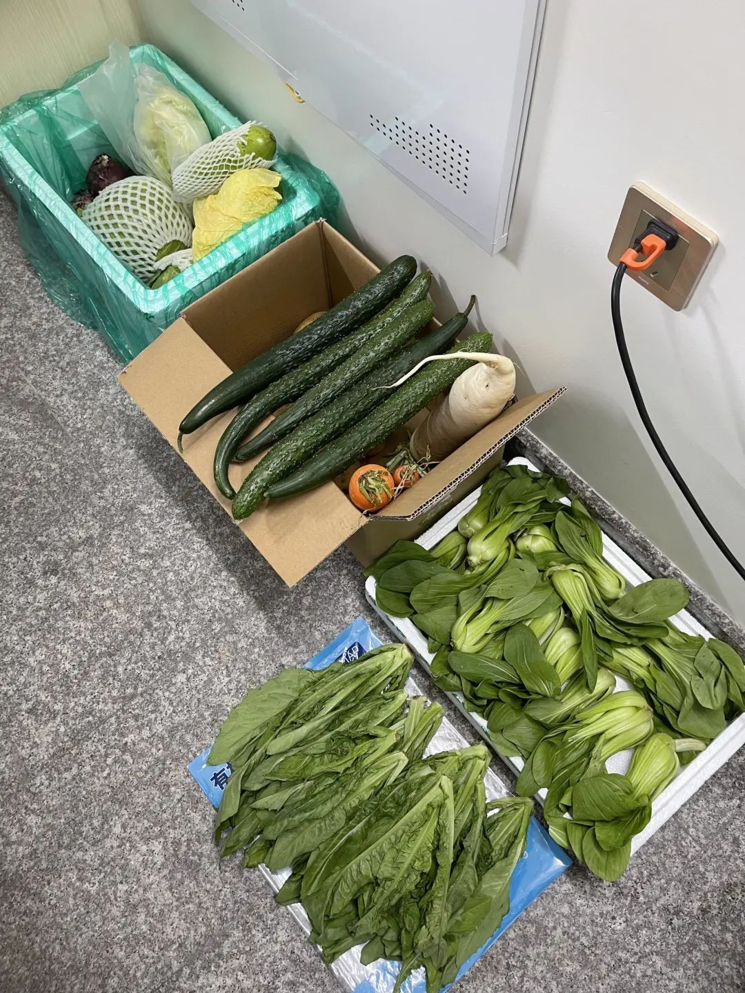 我连续三次买了蔬菜,加上政府发的,结果家里多了好多蔬菜,摊放在地上,感觉到了富足。冰箱也再次被各种食物塞满了。