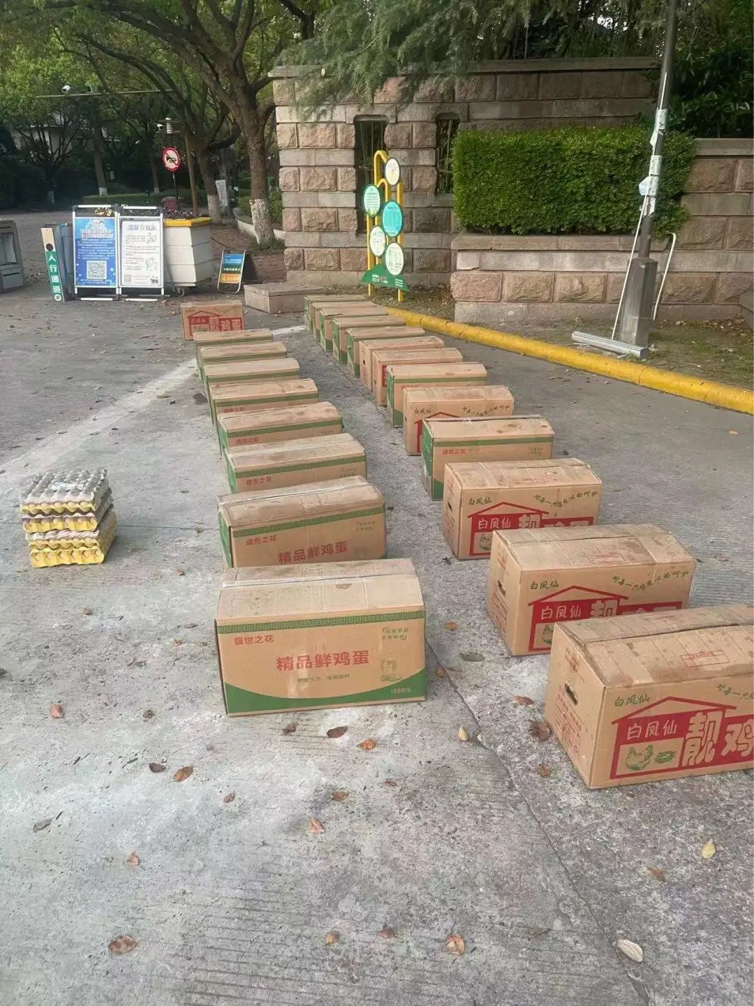 4月10日,5400个鸡蛋终于在傍晚6点多送到了,在小区门口浩浩荡荡的排成两列。