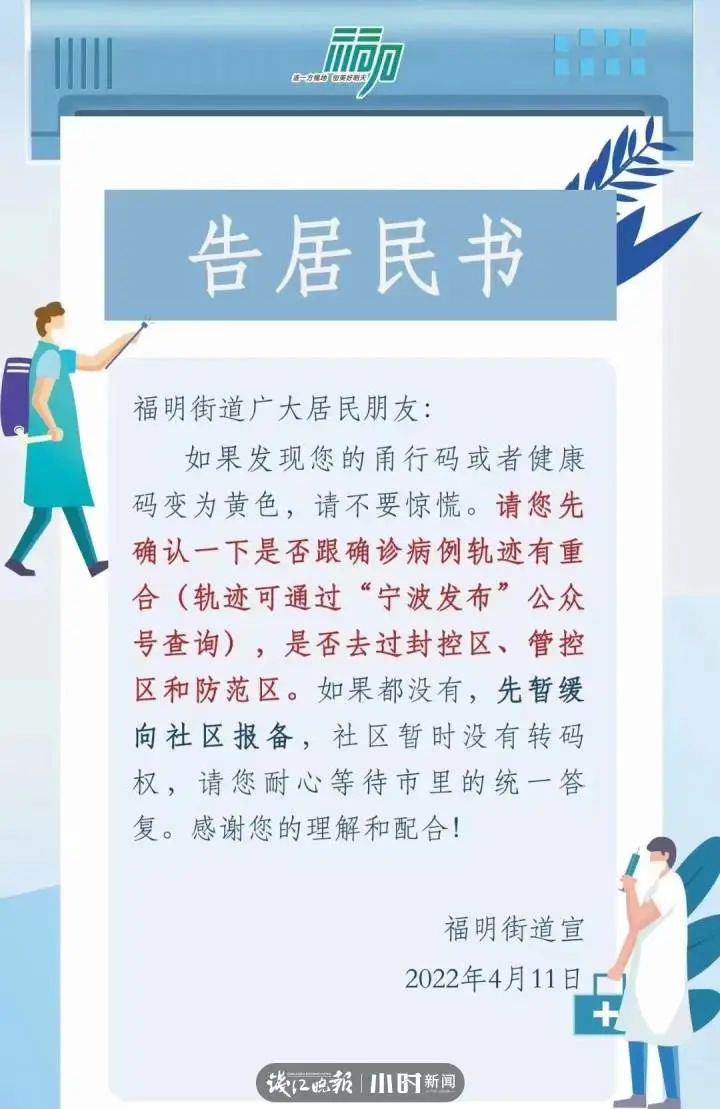 小时新闻记者发现很多社区都发了公告,提醒广大居民朋友一旦发现甬行码或者健康码变为黄色,不要惊慌。先确认是否与确诊病例轨迹有重合,是否去过封控区、管控区和防范区;如果都没有,暂缓向社区报备,请耐心等待市里的统一答复。