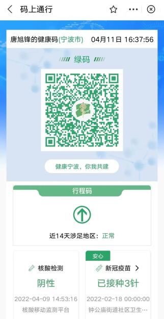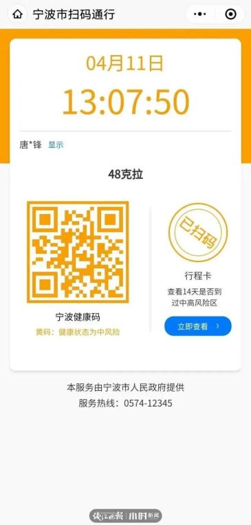 同样在今天上午,《宁波日报》教了大家一招,通过浙里办健康宁波版,点击码上通行,可进入四码合一(即健康码、行程码、核酸检测结果和疫苗接种)页面。如发现黄码,可进行码色申诉,只要耐心等待即可。