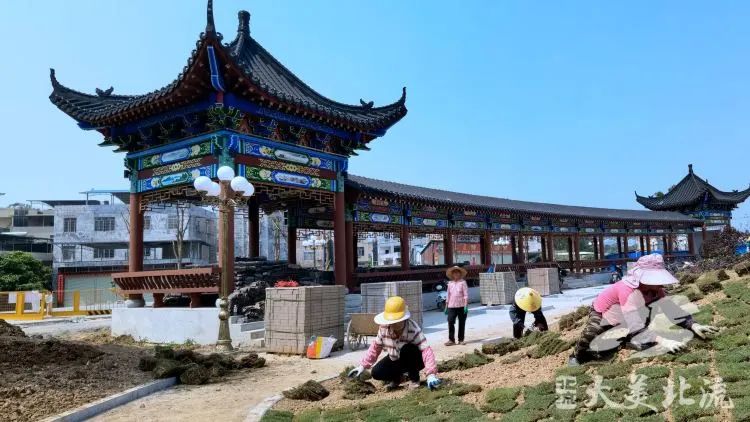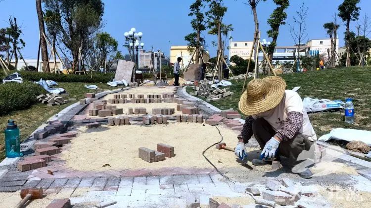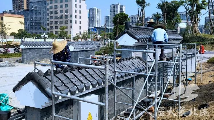 4月8日,记者在北流乡贤文化公园各个项目建设工地看到,施工工人有的在铺设园路,有的在给西广场的文化墙贴砖或琉璃瓦,有的在完善西河景观带的绿化设施,还有的在建筑广场、东门广场铺设最后几平方米的大理石和透水砖,园林工人正在对环园路两侧没完成绿化的部分进行平整土地、种植花草,或是给已经种下的花草浇水养护,一派忙碌的施工景象 。