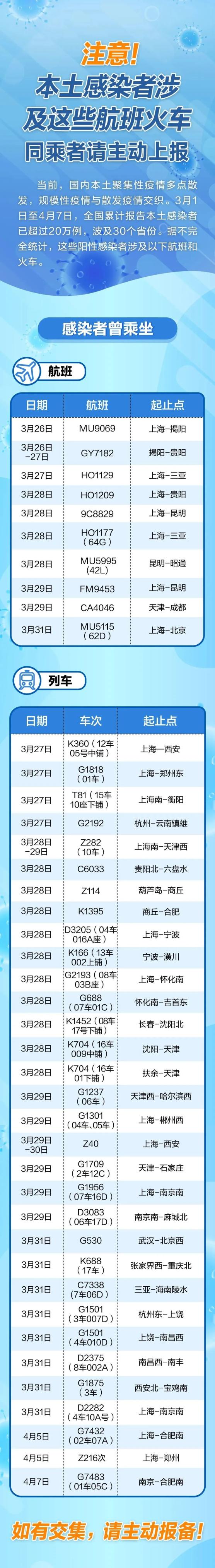 近期,国内多地陆续出现本土确诊病例。据了解,多名感染者及其密切接触者曾乘坐飞机和火车出行,请您仔细查看下图,如和图中交通工具有交集,请第一时间向居住地所在社区报告,并配合社区疫情防控工作人员,落实信息轨迹排查、核酸检测、健康监测、医学观察等防控措施,做好自身健康的“第一责任人”。