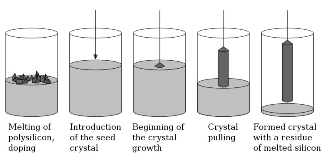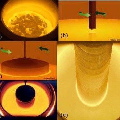 通过控制旋转的速度,和提拉的速率,我们就能得到不同宽度,不同长度的圆柱形单晶硅棒。