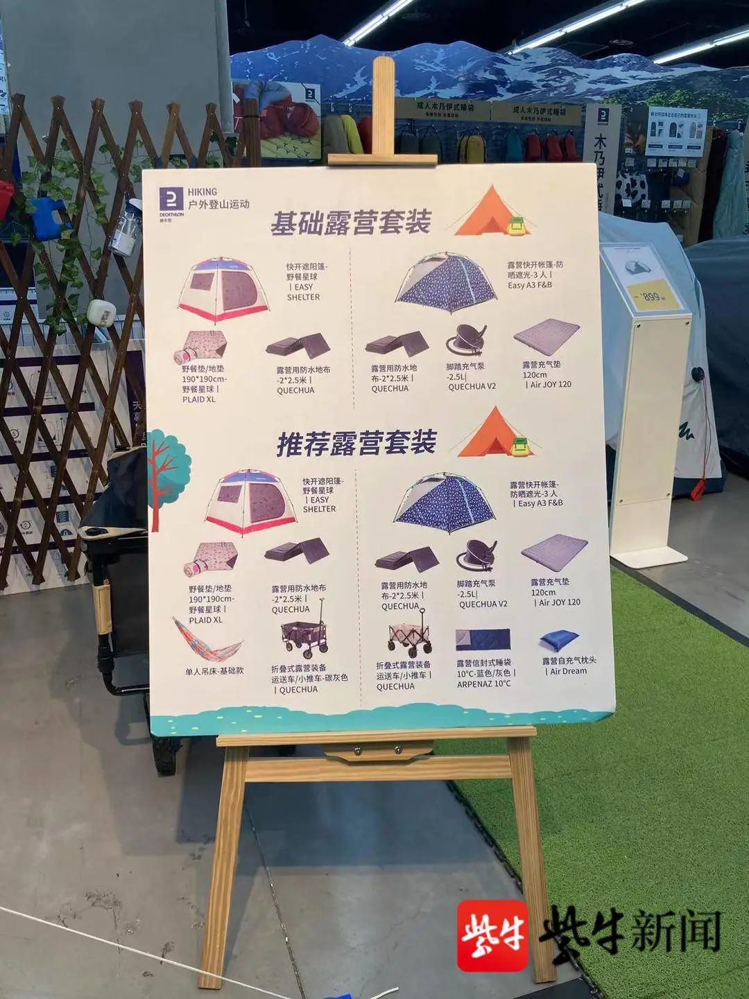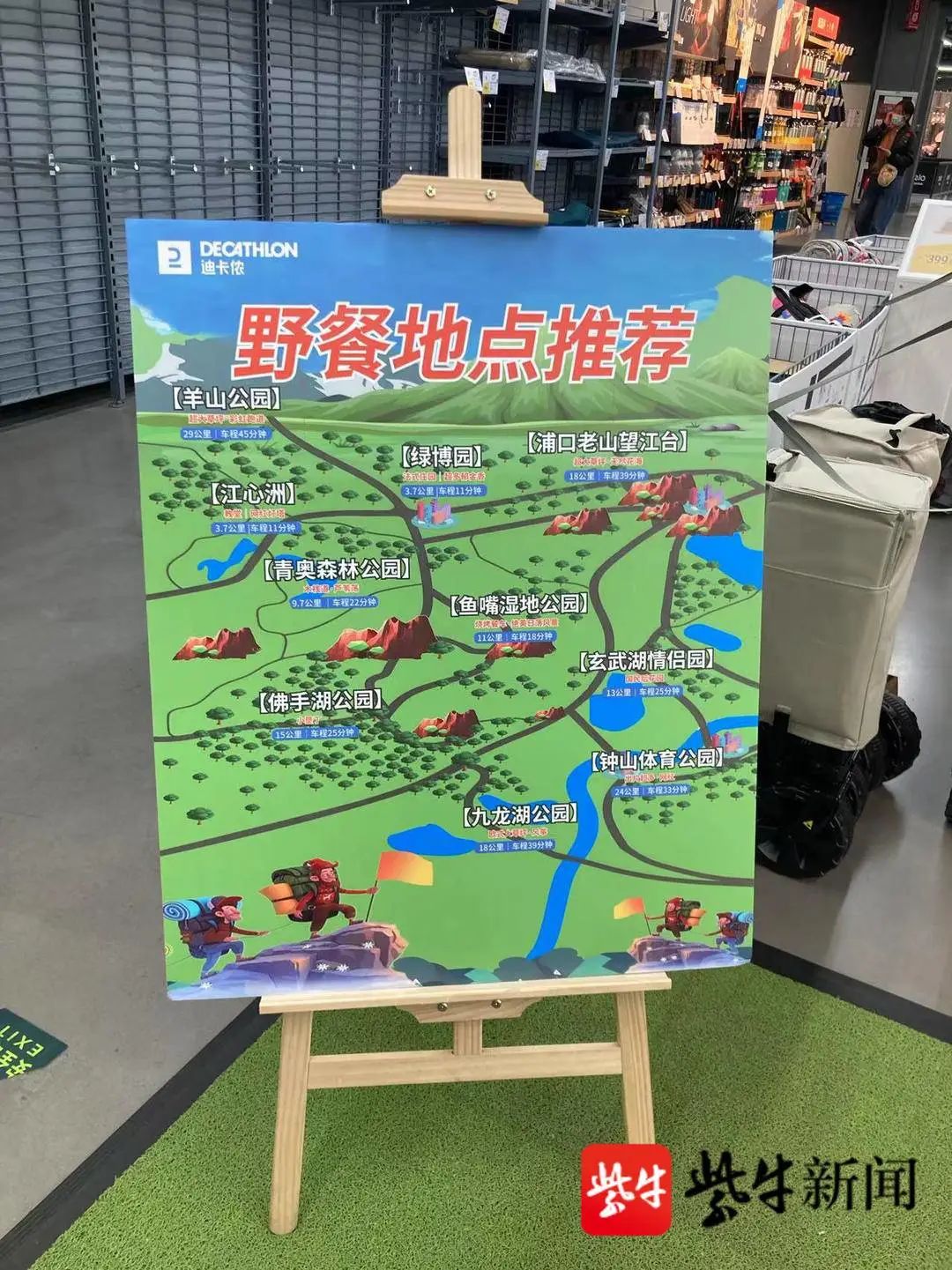 除了帐篷之外,一些周边产品也陈列在了店内进门的显眼位置,包括信封式睡袋、吊床、折叠式小推车等,供市民朋友们进行选择购买。店内还放置了提示牌,对野餐地点和露营套装进行了详细的介绍和推荐。记者注意到,南京市适合春游的地点还真不少,包括绿博园、钟山体育公园、玄武湖情侣园、老山、江心洲、鱼嘴湿地公园、佛手湖公园等等。