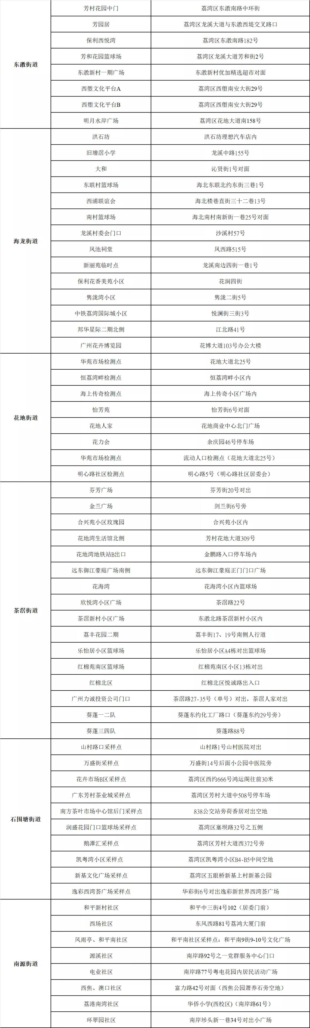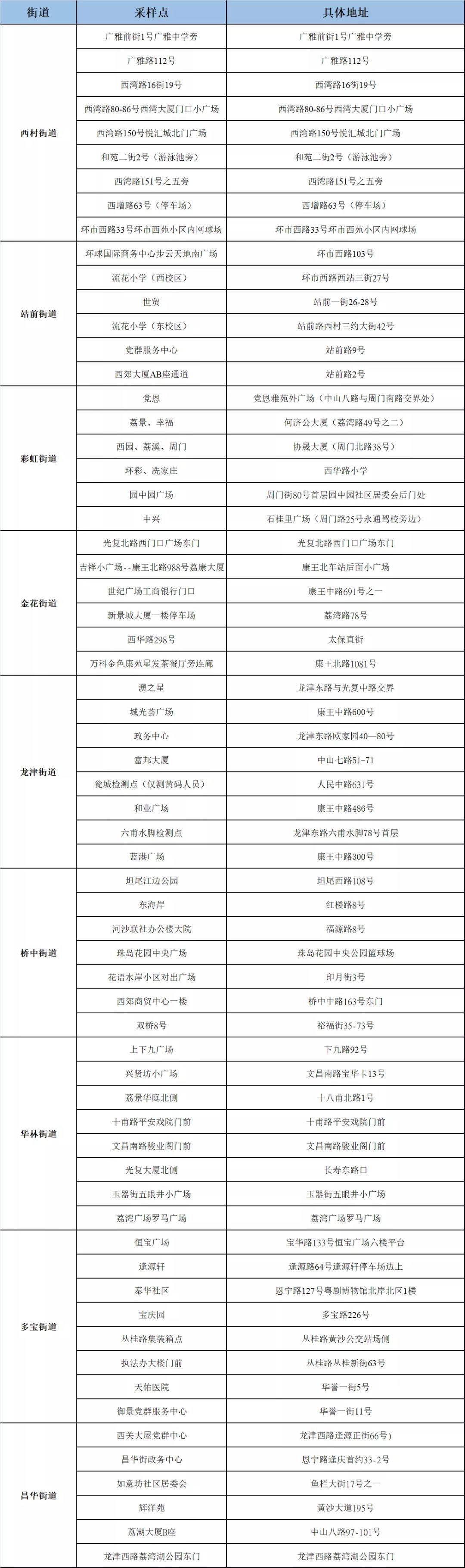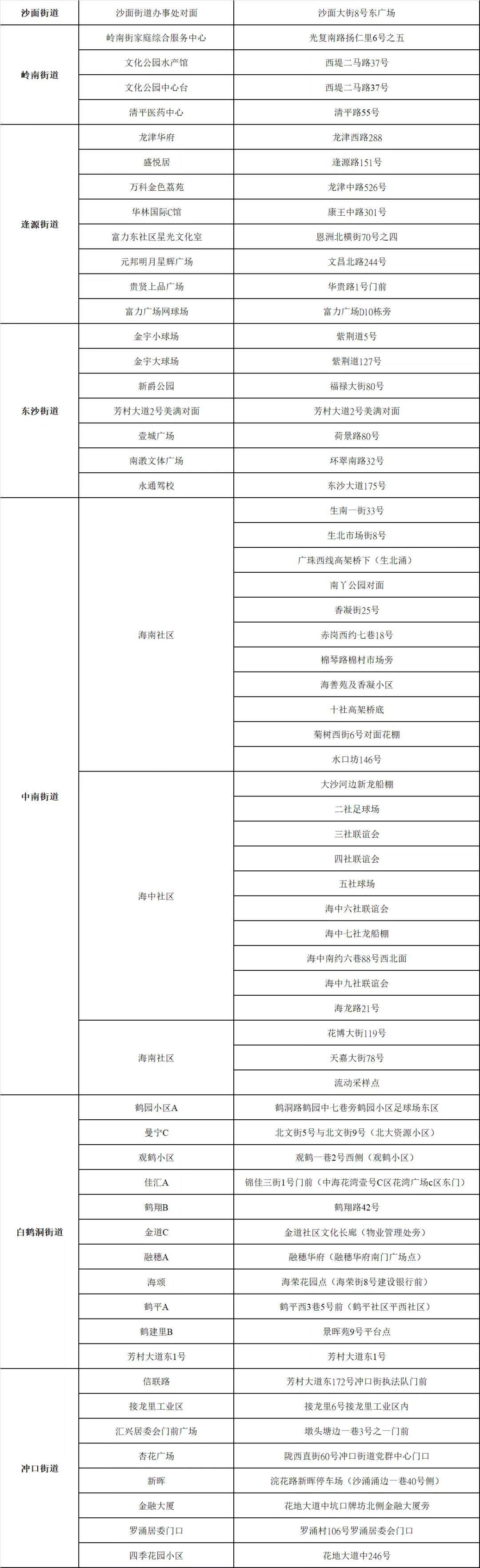(一)南源、逢源、多宝、昌华、岭南、华林、沙面、桥中、石围塘、花地、茶滘、冲口、白鹤洞、东漖、中南、东沙、海龙共17条街道于上午10时开始,截止时间晚上22时。
