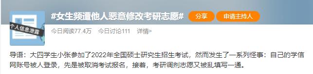 近日,一考研女生调剂志愿被他人篡改一事登上热搜,目前已联系网警进行调查。