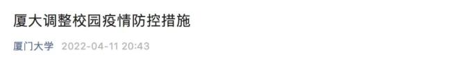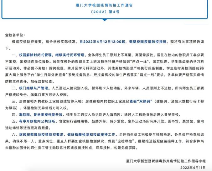 11日晚,厦门大学表示,自2022年4月12日12:00起,调整校园疫情防控措施,校园解除封闭式管理,继续实行闭环管理。