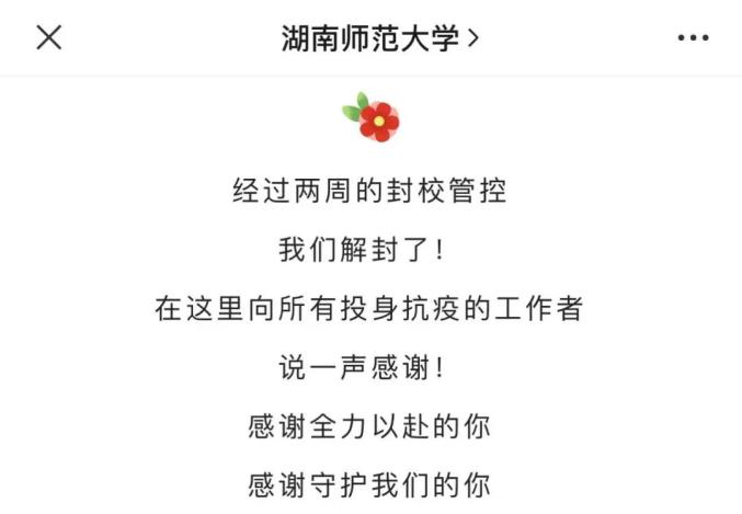 同日,湖南师范大学也发文:“经过两周的封校管控,我们解封了!”