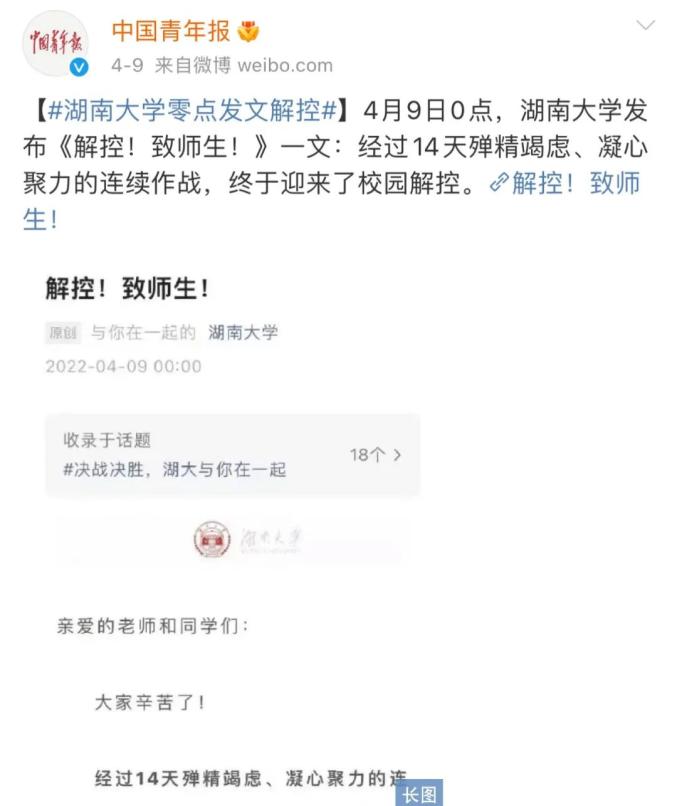 4月9日0点,湖南大学发布《解控!致师生!》一文,宣布校园解控。