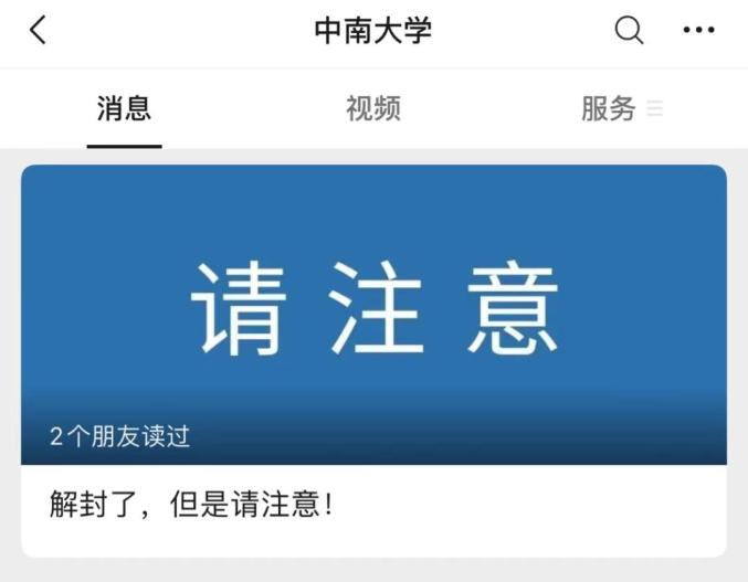4月9日,中南大学发布《解封了,但是请注意!》一文:解封不解防,防疫不松懈。请大家保持警惕,严格遵守防控政策,一起珍惜来之不易的阶段性防疫成果!