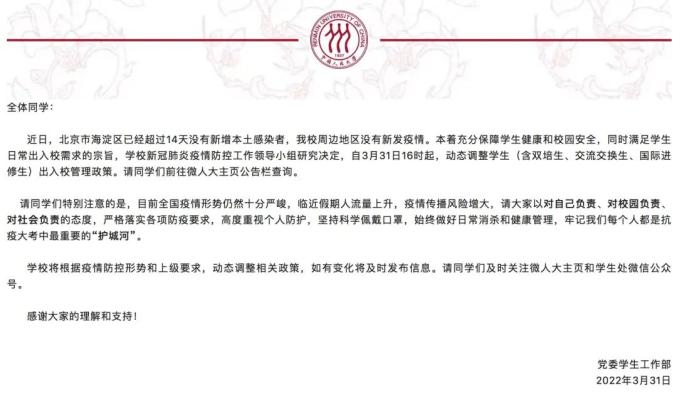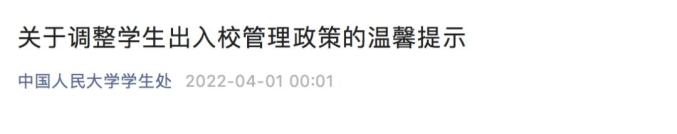 此外,据微信公号“中国人民大学学生处”消息,自3月31日16时起,学校动态调整学生(含双培生、交流交换生、国际进修生)出入校管理政策。