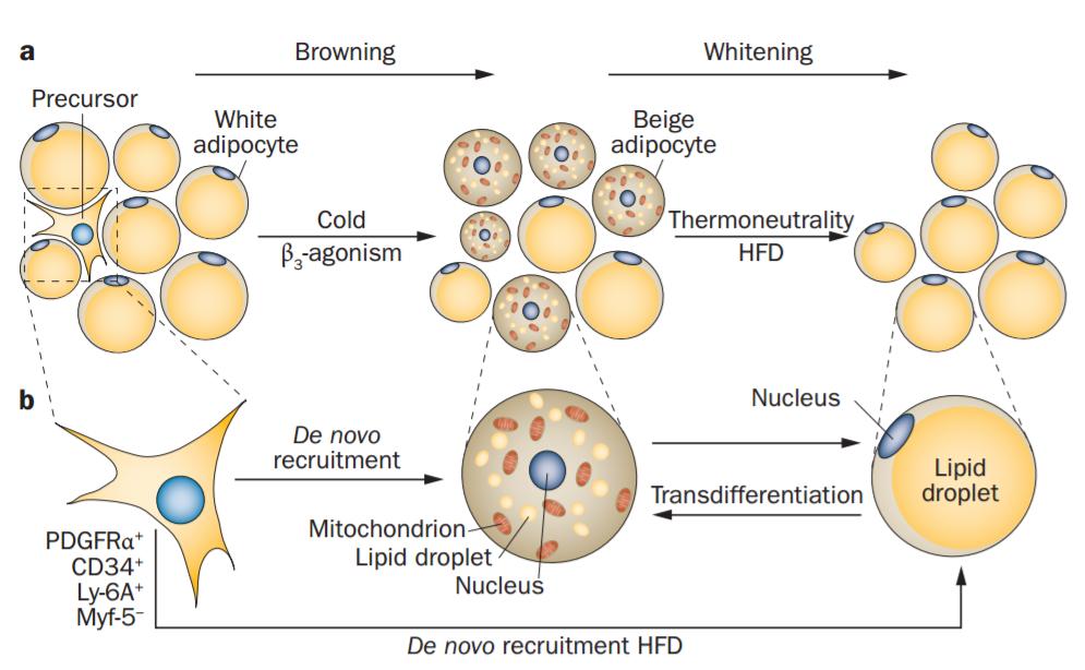 我们都知道肥胖是指机体总脂肪量过多和(或)局部脂肪含量增多及分布异常,但并不是所有的脂肪组织都是坏的。哺乳动物的脂肪组织可根据解剖位置和功能特性分成白色脂肪、棕色脂肪及米色脂肪。其中白色脂肪负责存储多余的热量,棕色脂肪促进脂肪分解产热,而米色脂肪静息时与白色脂肪类似,而在寒冷刺激、运动或激活β肾上腺素受体时,米色脂肪中解偶联蛋白-1(UCP-1)蛋白表达增加,可促进产热和能量消耗。这种现象被称为白色脂肪棕色化,可作为肥胖和代谢疾病防治中的重要靶点[3]。