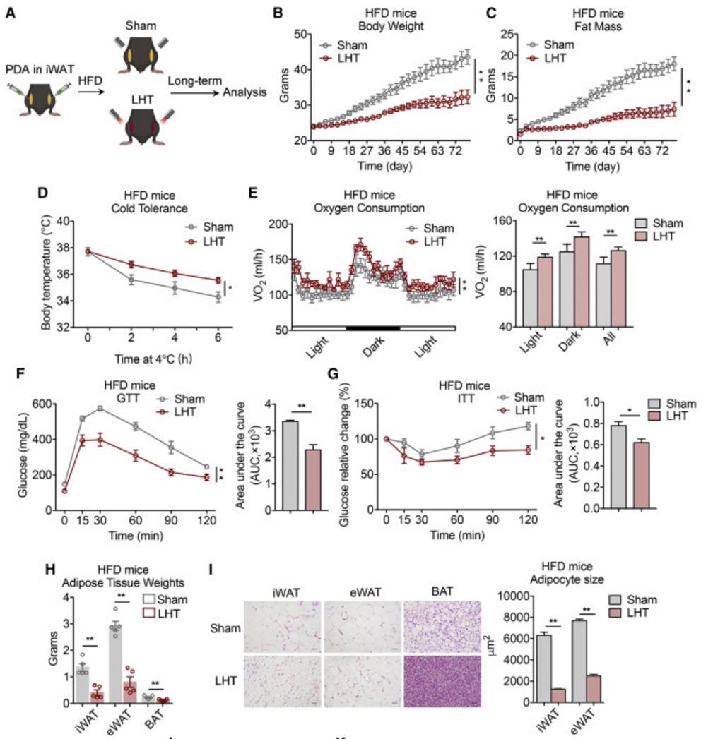 对于一种新技术的使用,安全性和有效性是最受关注的问题。因此,团队首先在小鼠中验证LHT长期使用的效果。与对照组相比,LHT组可在不依赖中枢交感神经系统和免疫系统的情况下,通过减少肝脏脂质沉积、改善糖脂代谢、提高胰岛素敏感性等机制预防和治疗高脂饮食诱发的小鼠肥胖,并不产生明显的毒副作用,证实了长期使用LHT的安全性和有效性。
