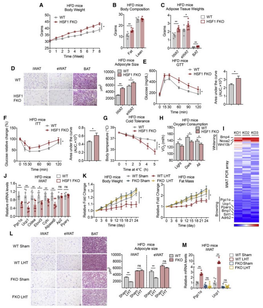 研究人员通过构建HSF1脂肪特异性敲除小鼠探索LHT促进米色脂肪产热的机制。结果显示局部热疗以HSF1依赖的方式抵抗和治疗肥胖,减轻胰岛素抵抗和脂肪肝。研究团队还发现小鼠米色脂肪过表达激活型HSF1同样能预防肥胖和改善肥胖。