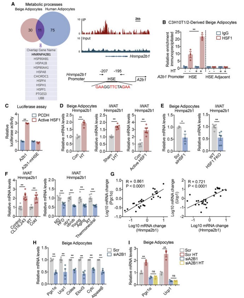 为了进一步阐明HSF1调控米色脂肪激活的机制,研究人员利用染色质免疫共沉淀测序(ChIP-Seq)技术,在全基因组范围内筛查米色脂肪中HSF1的下游靶点,发现HSF1可能通过影响下游分子HNRNPA2B1 (A2B1)转录发挥调控作用。