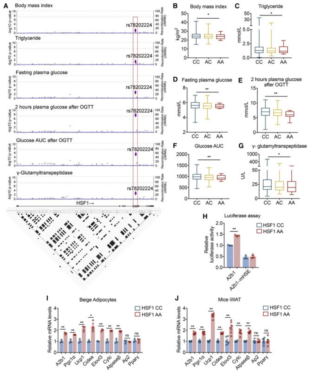 不同基因型受试者的特征有明显差异,而携带A等位基因的受试者与多种代谢性状的改善相关,如较低的体重指数(BMI),低血清甘油三酯水平、更好的糖耐量及更低的γ-谷氨酰转肽酶水平降低等(让人流下了羡慕的泪水~)。并且HSF1的这一功能性突变能够在细胞和小鼠中促进A2B1及棕色脂肪相关基因(Pgc1α、Ucp1、Cidea、Elovl3、Cytc)的表达,证实激活HSF1-A2B1转录途径对于肥胖的防治具有重要临床意义。