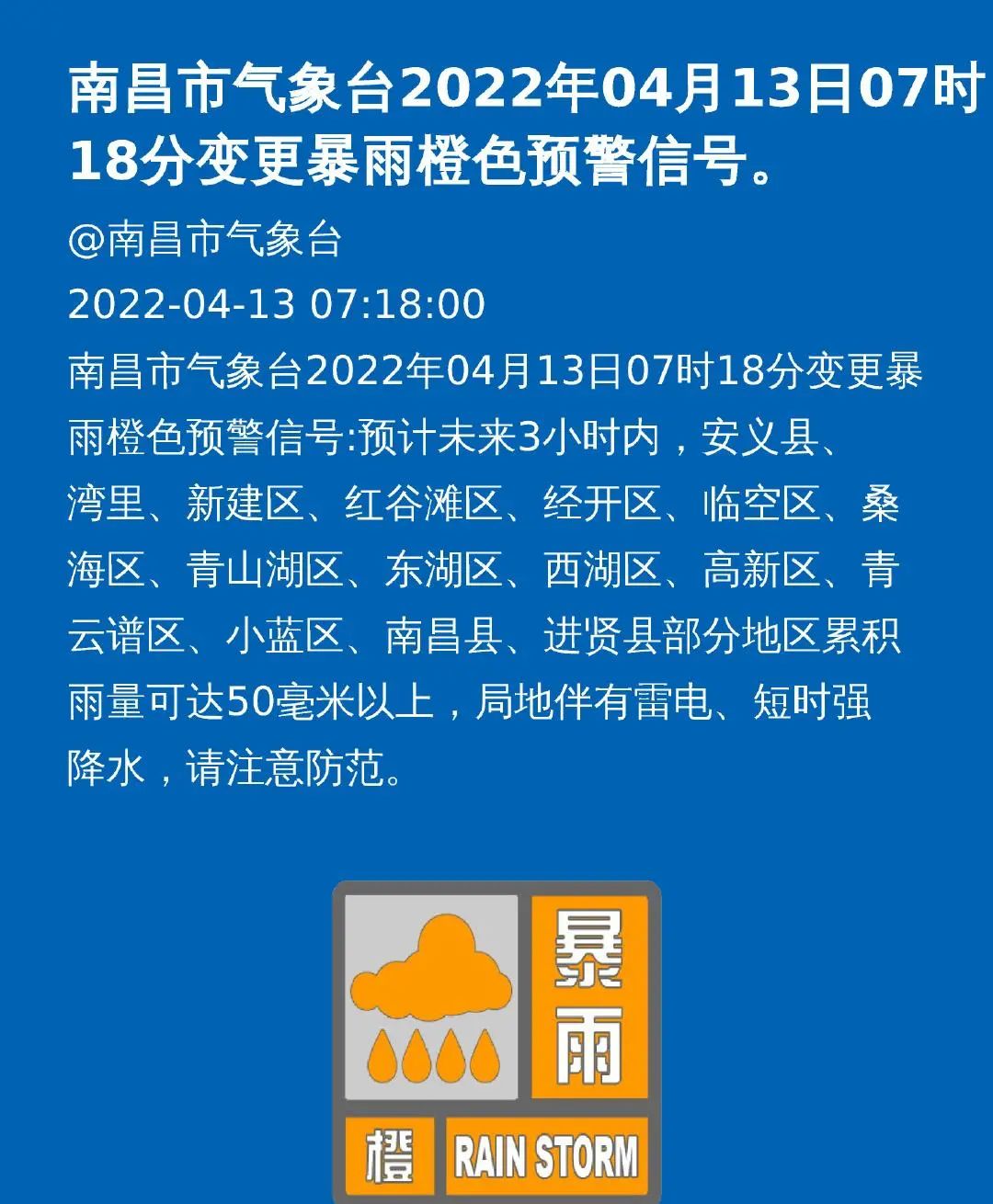 南昌市气象台2022年04月13日07时18分变更暴雨橙色预警信号