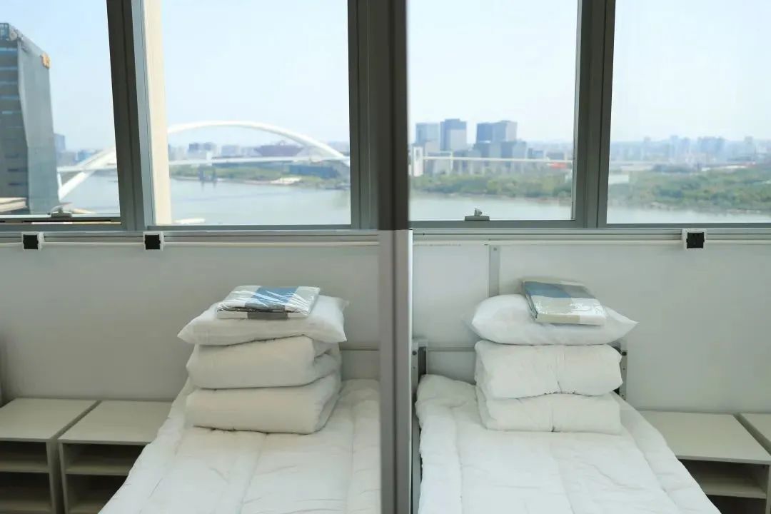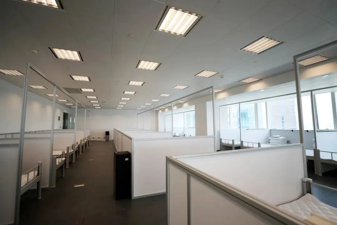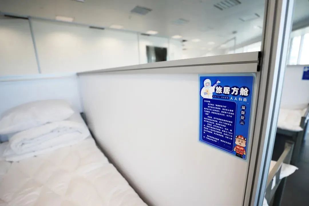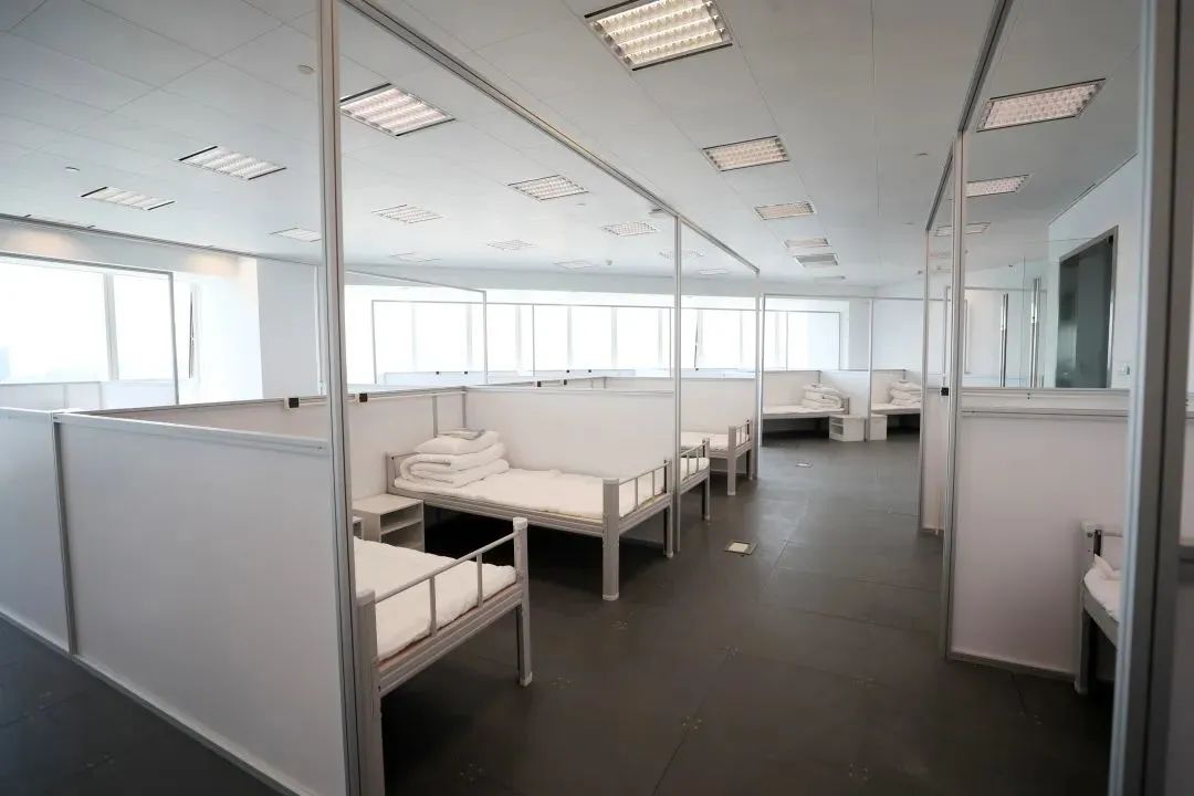 4月11日,历经96小时日夜赶工的黄浦区日晖东路555号方舱医院顺利交付,整洁明亮的生活区,配套完善的医护通道及卫浴区均全面完成。