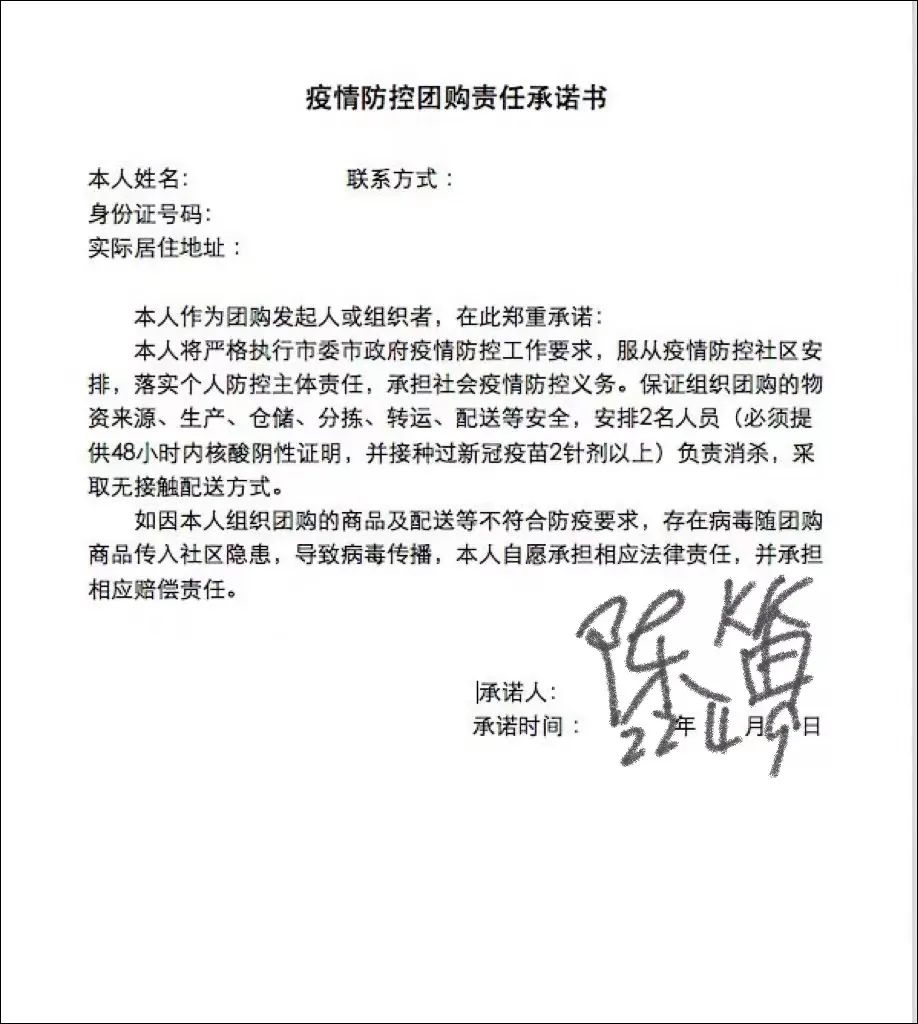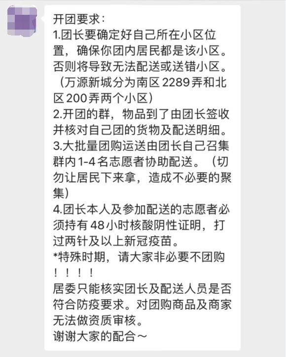 居委会给出了明确的开团要求,团长需要签下承诺书,全程负责货物的消杀、分拣、配送等工作。大批量的团购运送需要团长自己召集群内1-4名志愿者协助配送,采取无接触配送方式。团长及参加配送的志愿者持有48小时核酸阴性证明,并打过两针及以上新冠疫苗。