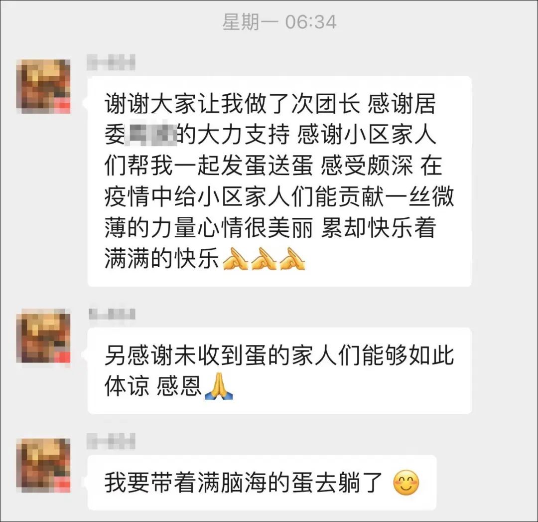 尤其是发完蛋那天,我睡的比较晚,早上五六点钟才睡。有醒的早的邻居一大早就看到自己买的蛋已经在门口了,他们在群里说,一早醒来看到鸡蛋就像圣诞老人给他们送礼物一样。群里很多邻居都感谢了我和志愿者们。