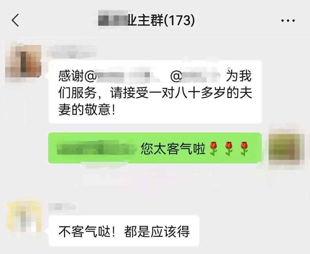 因为率先做了小区内第一个团长,群里很多人向我表达了感谢。让我印象深刻的是,一位老人在群里说“请接受一对80多岁的夫妻的敬意”。