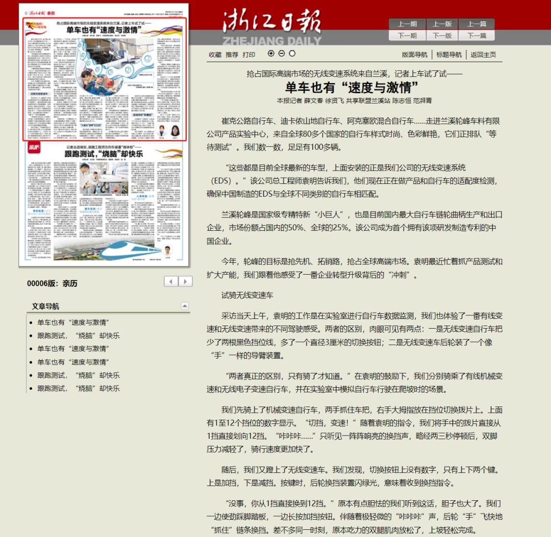 原标题:《《浙江日报》点赞兰溪企业!轮峰“硬核”科技,单车也有“速度与激情”》