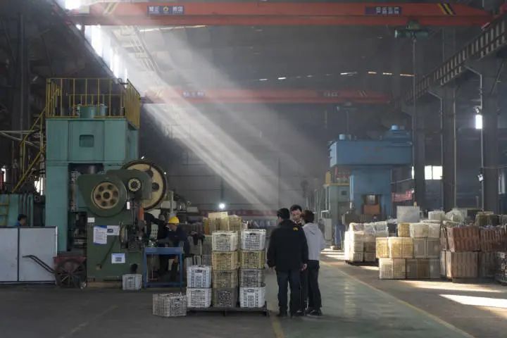 我们来到了冷锻车间,数台巨型机床轰鸣作响,一缕阳光从厂房顶部排风口直射进来,给带着冰冷金属质感的工厂增添了一丝温柔。