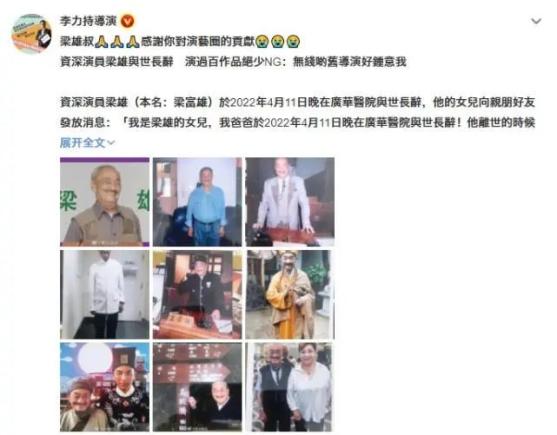 梁雄去世的消息公布后,圈内好友也纷纷发文哀悼。导演李力持在微博发文表示,“梁雄叔,感谢你对演艺圈的贡献。”演员刘锦玲也转发李力持的微博,并配文悼念:“一路走好!”不少网友也留言悼念这位老戏骨:“一说名字可能不认识,一看脸原来是他!老爷子,一路走好!”“从小看着他们的剧长大,然后又看着这些老演员一个个相继离世,心中无限唏嘘。”